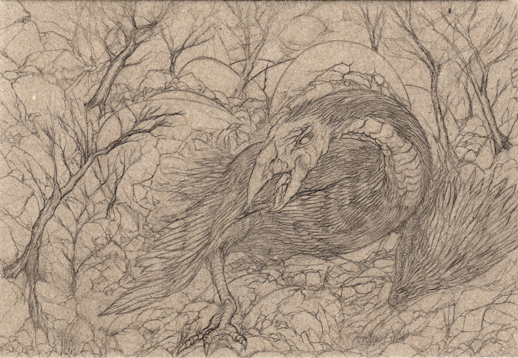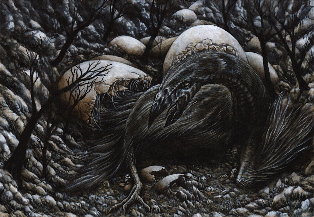 This postcard is a peek into the domestic lives of some of the wildfowl inhabiting the dark and barren reaches of a high mountain range. All babies need to eat, and we can be sure Mother Feather takes very good care of her young. Of course, straying too close to a hungry babe while being a nutritious and tasty morsel is rarely a wise idea. I strongly recommend staying well away from the mountain nesting places.
